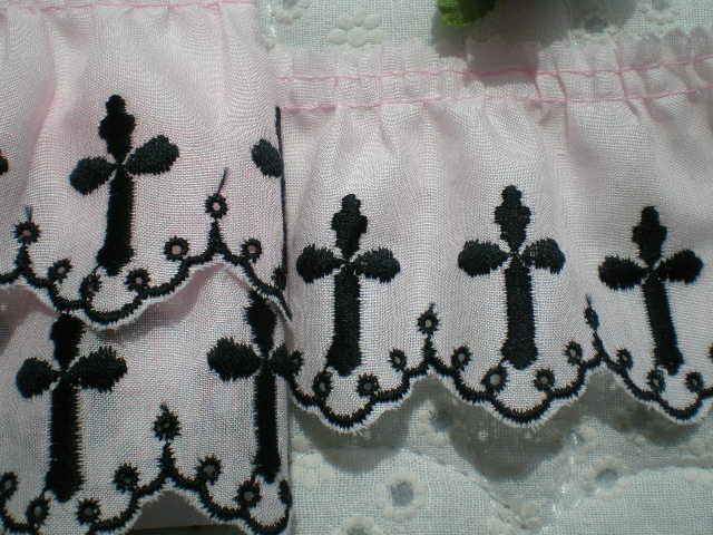 幅約5.5c ピンク地にクロの綿のフリル ちょっとゴスロリ!? 十字架柄 1M