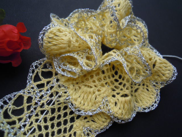 ホーム | お求めやすいワンコイン(100円)レース > トーションとブレード簡単にレースの花が作れるちょっとシックなフラワートーション!!! キイロXシルバー 30c