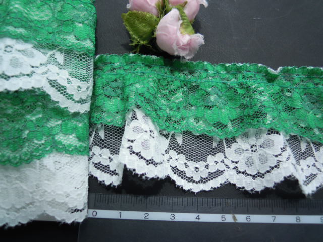 ホーム | スリーコインズ(300円)・レース > ゴスロリレース(2重フリル)お買い得!と〜っても可愛い2段レース オフシロXグリーンのゴスロリ 2M