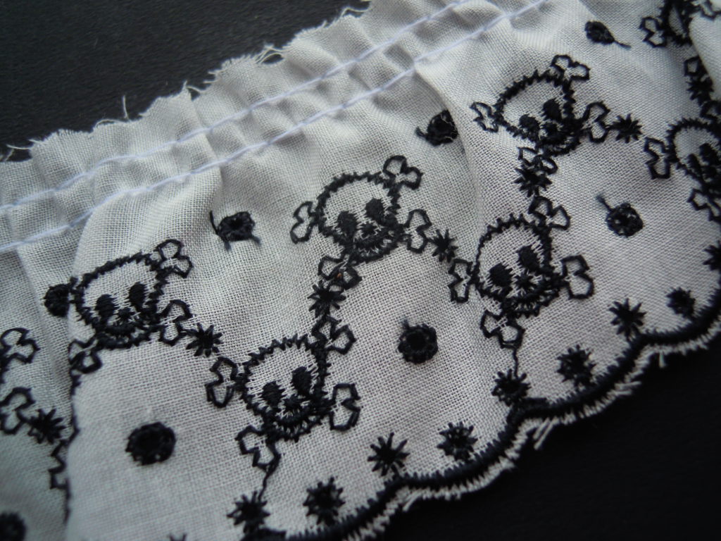 ホーム | スリーコインズ(300円)・レース > ゴスロリレース(2重フリル)幅約5.2c オフ地にクロの綿フリルのちょっとゴスロリ!? ドクロ柄 1M